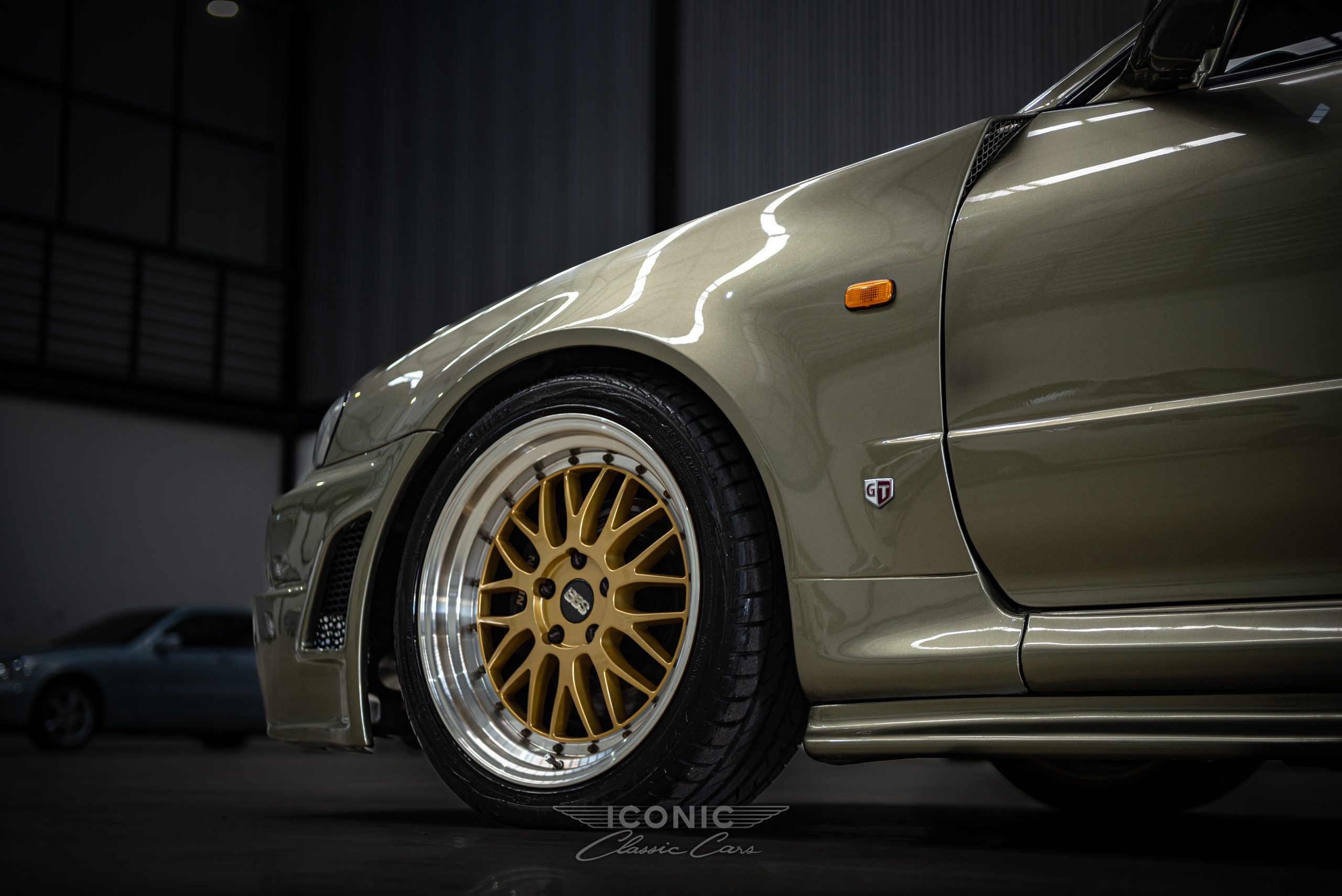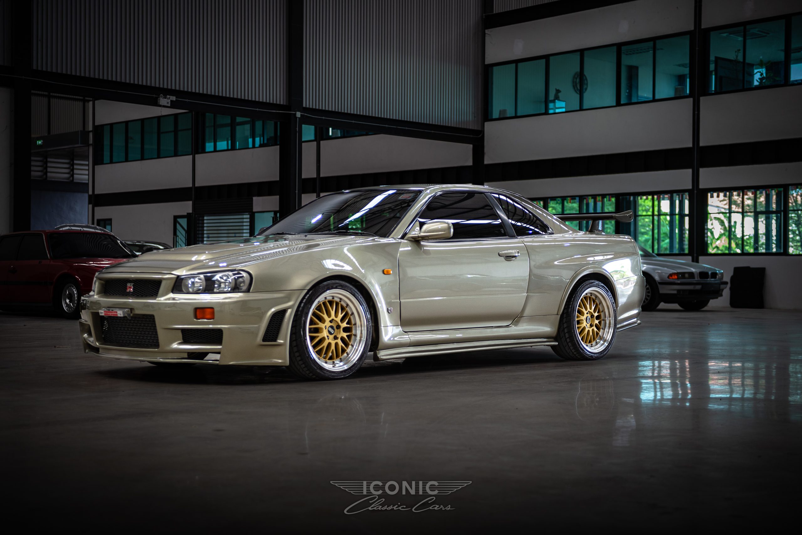 This Nissan Skyline R34 comes finished in Millennium Jade, a legendary and quite stunning colour that sets it apart and brings out all the lines and features of this icon. That colour scheme highlights the GT-R body kit with Z-tune bumpers and fenders, that graced arguably the most famous edition of the Skyline ever. It sits on gold BBS LM wheels with polished lips.